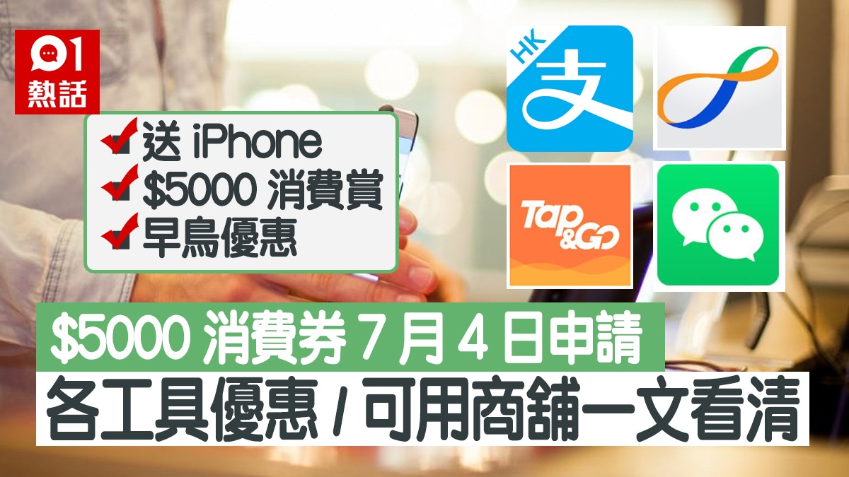 這裡幫你整合 hk$5,000 消費券懶人包,包括消費券申請與登記資料、消費券合資格人士資料、消費券如何使用方式與消費券商戶等,一於 bookmark 這 hk. 【5000元消費券/政府電子消費券/申請方法】政府「電子消費券計劃」選定由alipayhk(支付寶)、八達通octopus、tap & go拍住賞及wechat pay hong kong(微信支付)協助推行,2021年7月4日接受登記。 【消費券】書面申請表今起供下載及派發(附派表地點) 【消費券】銀聯與tap & go推300元獎賞 雲閃付app消費指定金額可獲最高3888元 陳楨怡磨練演技. $5000消費券申請日期 政府計劃於 2021年7月4日早上6時起接受登記,至8月14日為止 ,合共6個星期,最快可於 8月1日 獲發放第一期2,000元消費券。 $5000消費券發放渠道 $5000元電子消費券申請最新消息:政府將派發$5000元電子消費券,凡18歲以上香港永久性居民或新來港人士均可申請。 政府公佈$5000元電子消費券的4間入圍營運商為八達通、wechat pay hk、alipayhk支付寶香港、tap & go拍住賞,而早前的大熱payme 就沒有入圍。 【5000元電子消費券】財政預算案 公布會向派5000元 電子消費券, 到底何時派? 使用細節及申請資格、登記方法是怎樣?可以用來淘寶網購嗎?用八達通領取不可一次過收錢?消息指,政府暫定於7月4日(星期日)或5日(星期一)開始接受申請。 消費券直接等同八達通餘額 毋須個人八達通亦可登記(6月9日新增) 消息:傳7月初接受申請消費券 最快暑假內收到(6月9日新增) 市民或可經「智方便」登記消費券(6月9日新增) wechat pay hk推消費券活動 成功邀請親友選用獲20元加碼賞(6月9日新增) 電子消費券是什麼? 政府於今年的《財政預算案》中公佈,將向每名合資格人士派發總額共 hk$5,000 的電子消費券,以帶動本地消費。預計措施可惠及約720萬人,涉及約360億元財政開支。 hk$5,000消費券幾時開始接受申請?